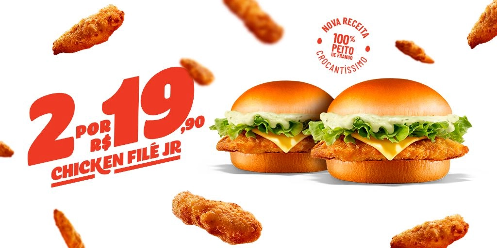 Para reforçar o frango como destaque do cardápio da rede, o Bob’s lançou a promoção Dupla Chicken Filé Jr por R$ 19,90. A ação faz parte de uma estratégia para ampliar a presença da proteína e atrair consumidores em busca de refeições com preço acessível
